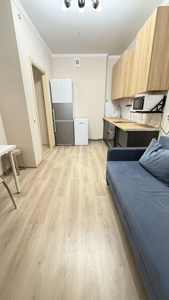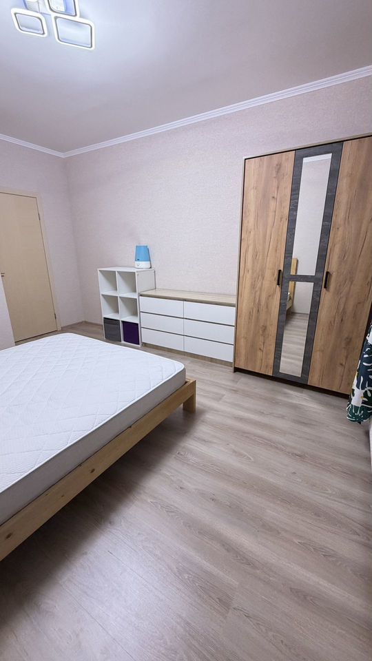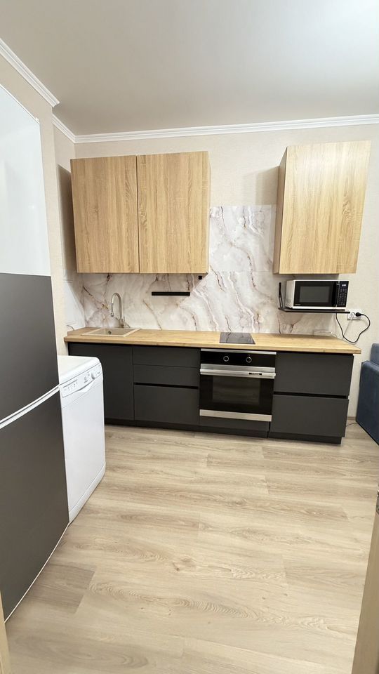 В квартире: прихожая-купэ, шкаф, комод и стеллаж для вещей, сушилка, кровать с матрасом Аskоnа, диван-кровать, полностью собранная кухня с электроплитой, микроволновка, чайник, холодильник, посудомойка, в ванной установлена стиральная машина, вся необходимая мебель.