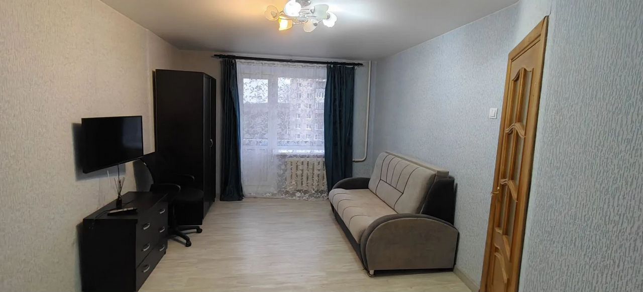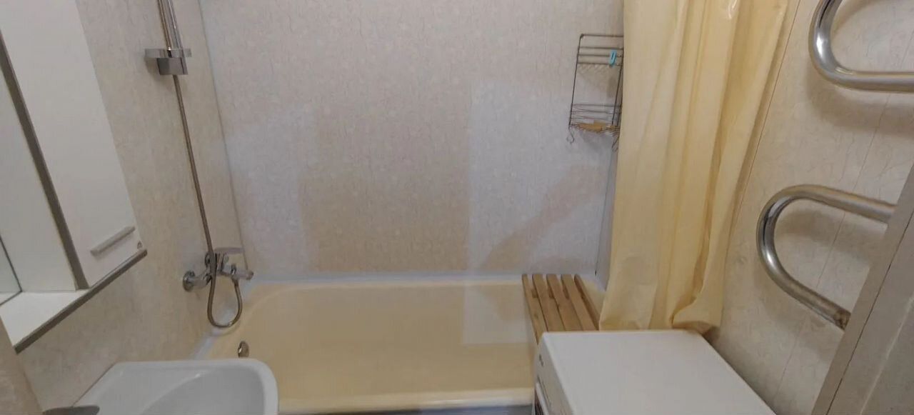 В квартире выполнен косметический ремонт. Просторная комната оборудована шкафом и диваном, что позволяет комфортно разместиться. Кухня оснащена необходимой бытовой техникой, включая холодильник и плиту. Санузел раздельный, оснащен ванной и стиральной машиной.