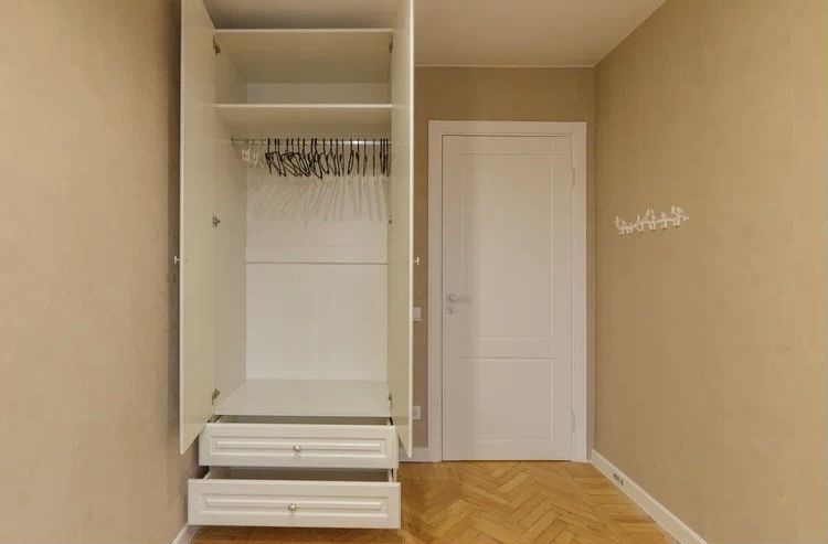 Третья комната — свободна под ваши потребности. В ней хороший плательный шкаф и дорогие обои. Она может стать кабинетом, дополнительной спальней, спортзалом, детской или мастерской.