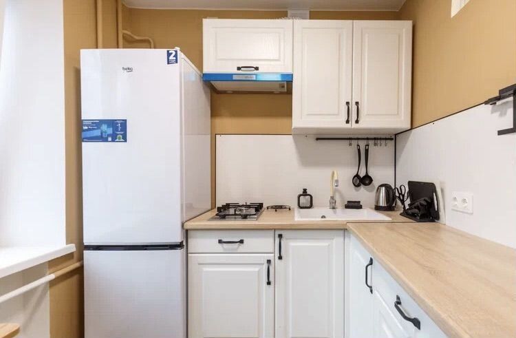 На кухне — складной стол-трансформер, новый большой холодильник Nо frоst, вытяжка и газовая панель.