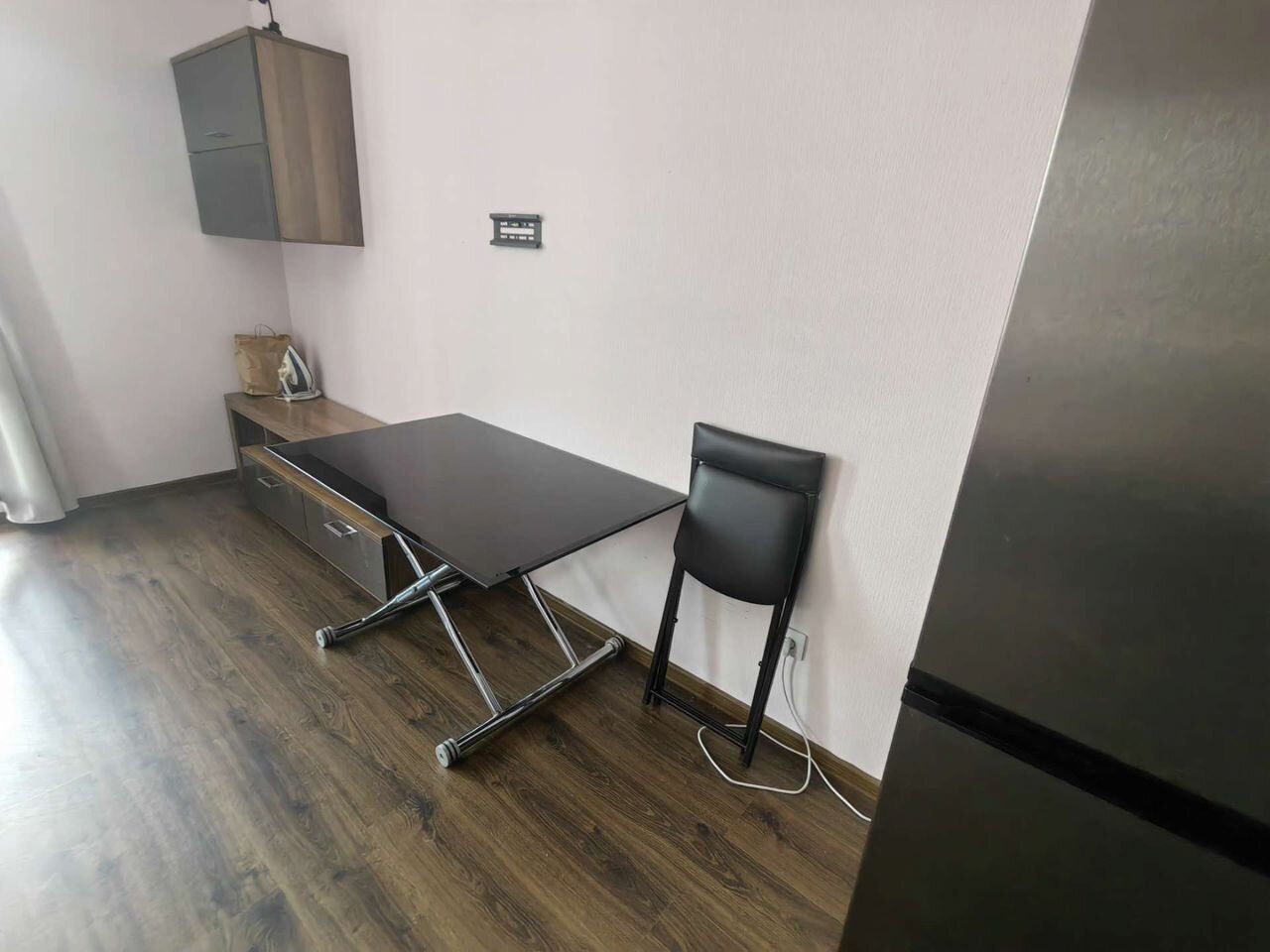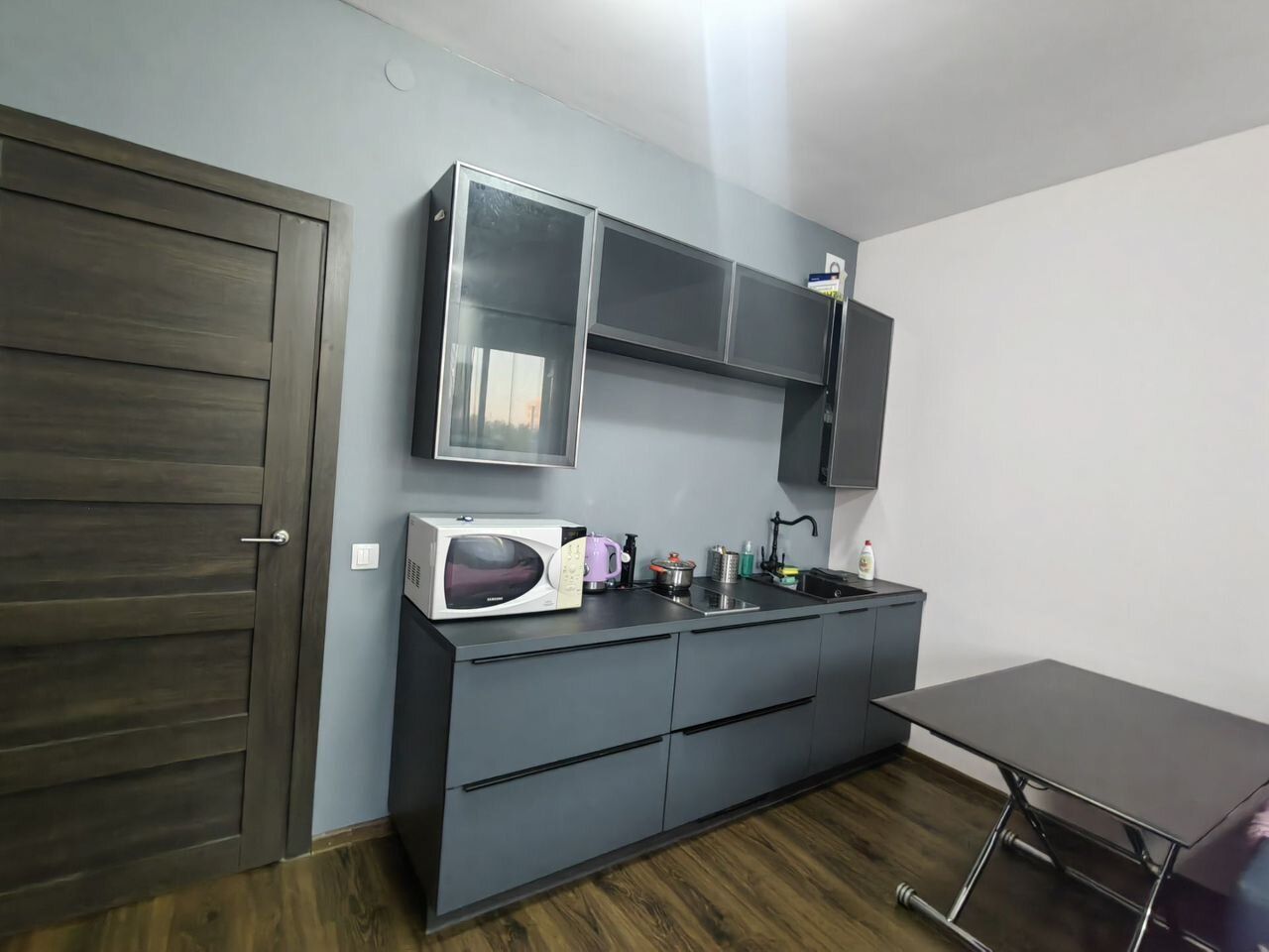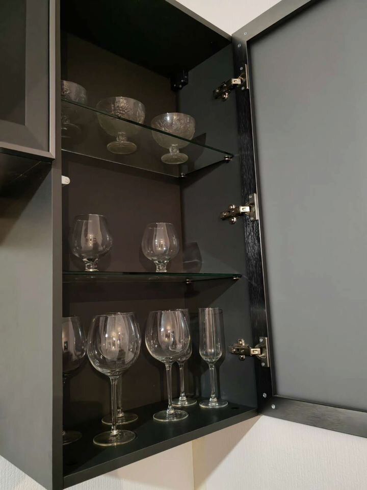 Стеклянный стол с подъёмным механизмом ,шикарная дорогая кухня, с полноценными доводчиками blum, верхние фасады из черного закаленного стекла с металлическим обрамлением,нижние с эффектом «антипалец» и матовой основой фасадов, столешница фактурная, под темный камень. большая раковина из искусственного камня,новый холодильник, стулья.