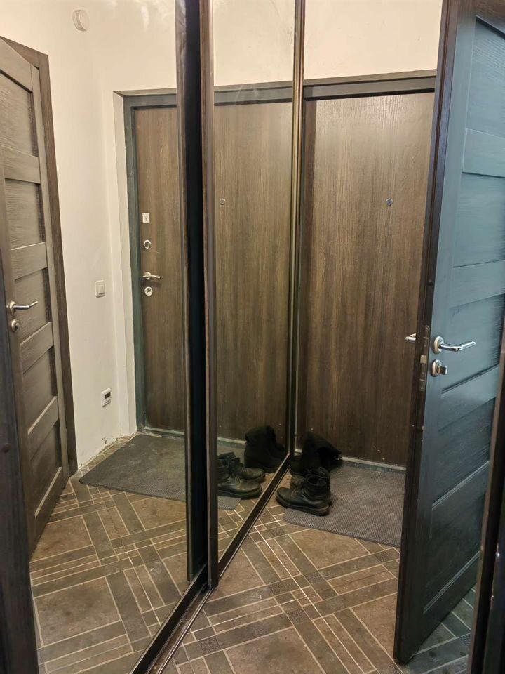 Настоящая большая гардеробная при входе ,поскольку у встроенного шкафа, двери до потолка и при этом они полностью зеркальные, то это вау, у вас почти 3м зеркала,и + огромный шкаф для хранения вещей.